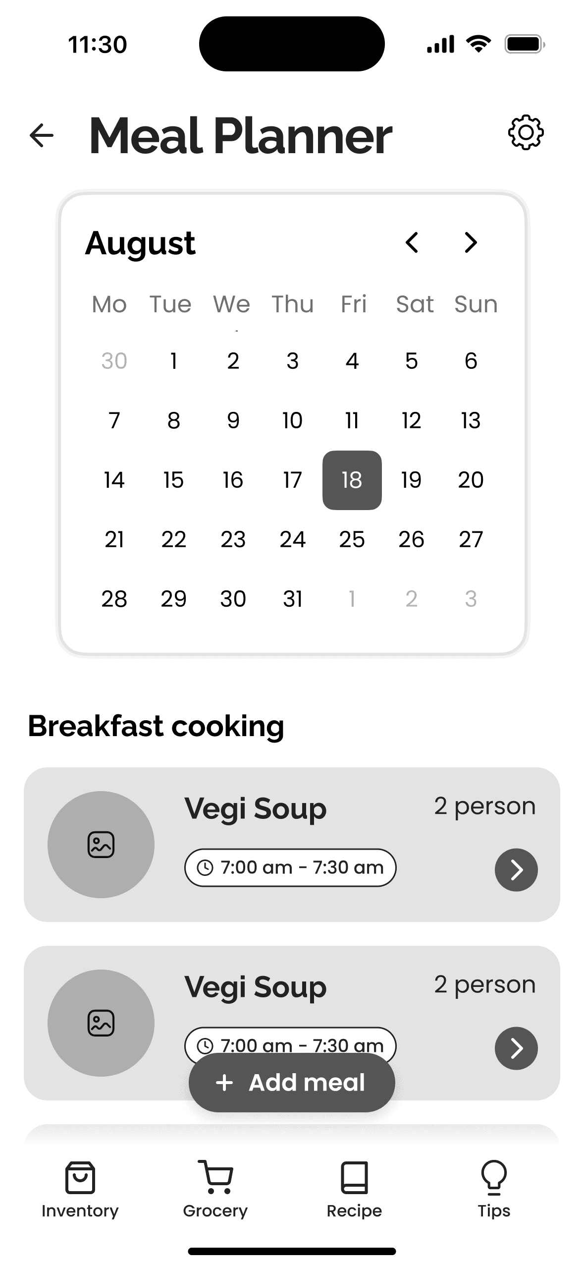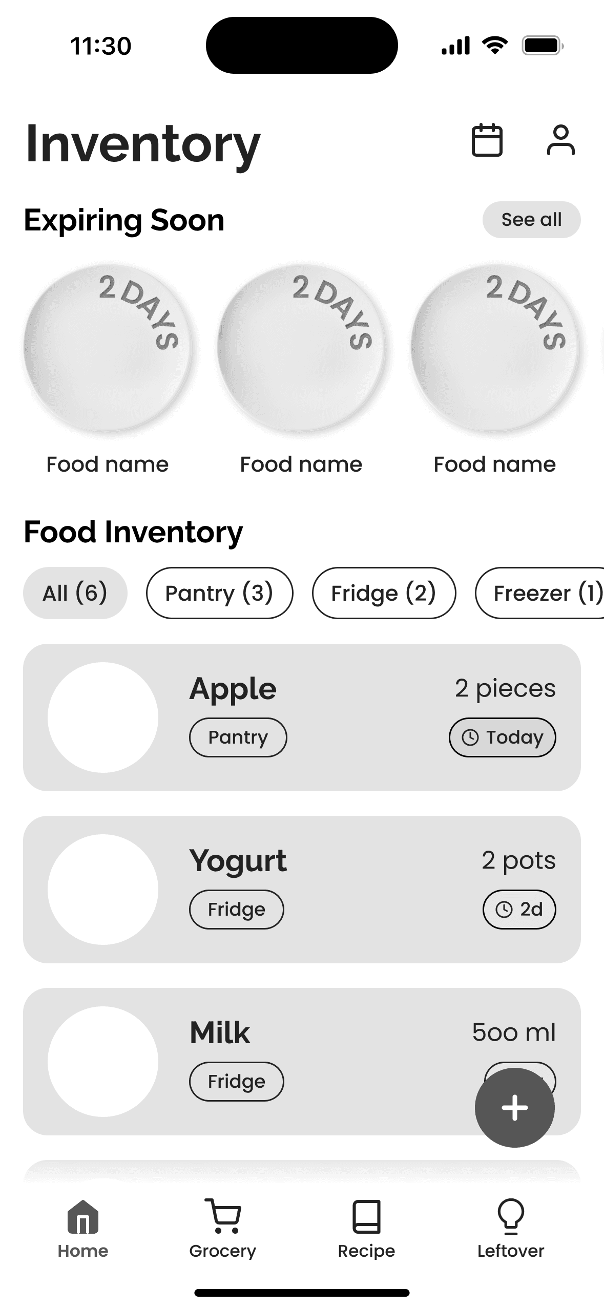 I co-designed a clean, visual inventory screen that allows users to see what they have at a glance, categorized by location (Fridge, Pantry). Crucially, it highlights items "Expiring Soon" to create a sense of urgency and prompt action.