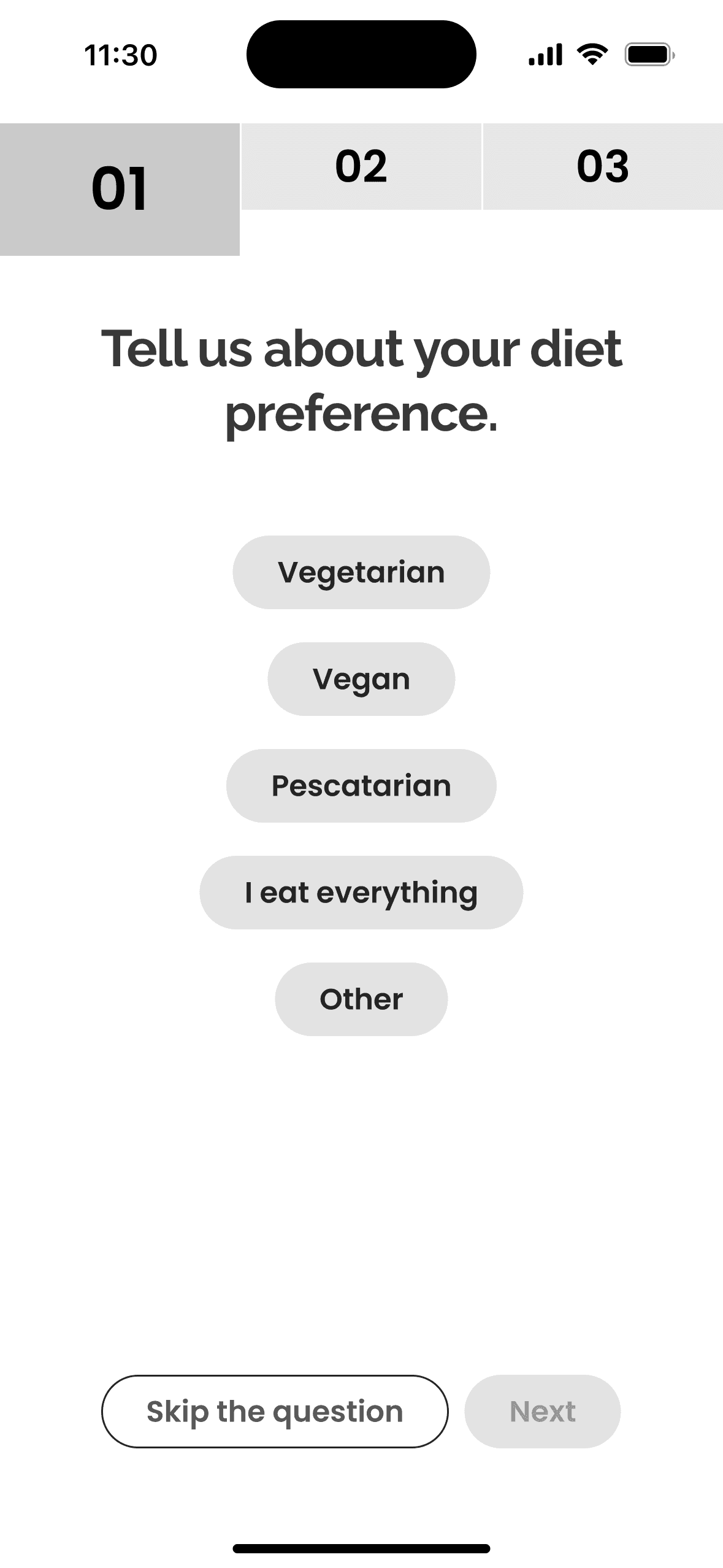 I co-designed the onboarding flow to focus on the user and ask them about their dietary preferences, ensuring that the app works in the exact way they would expect.